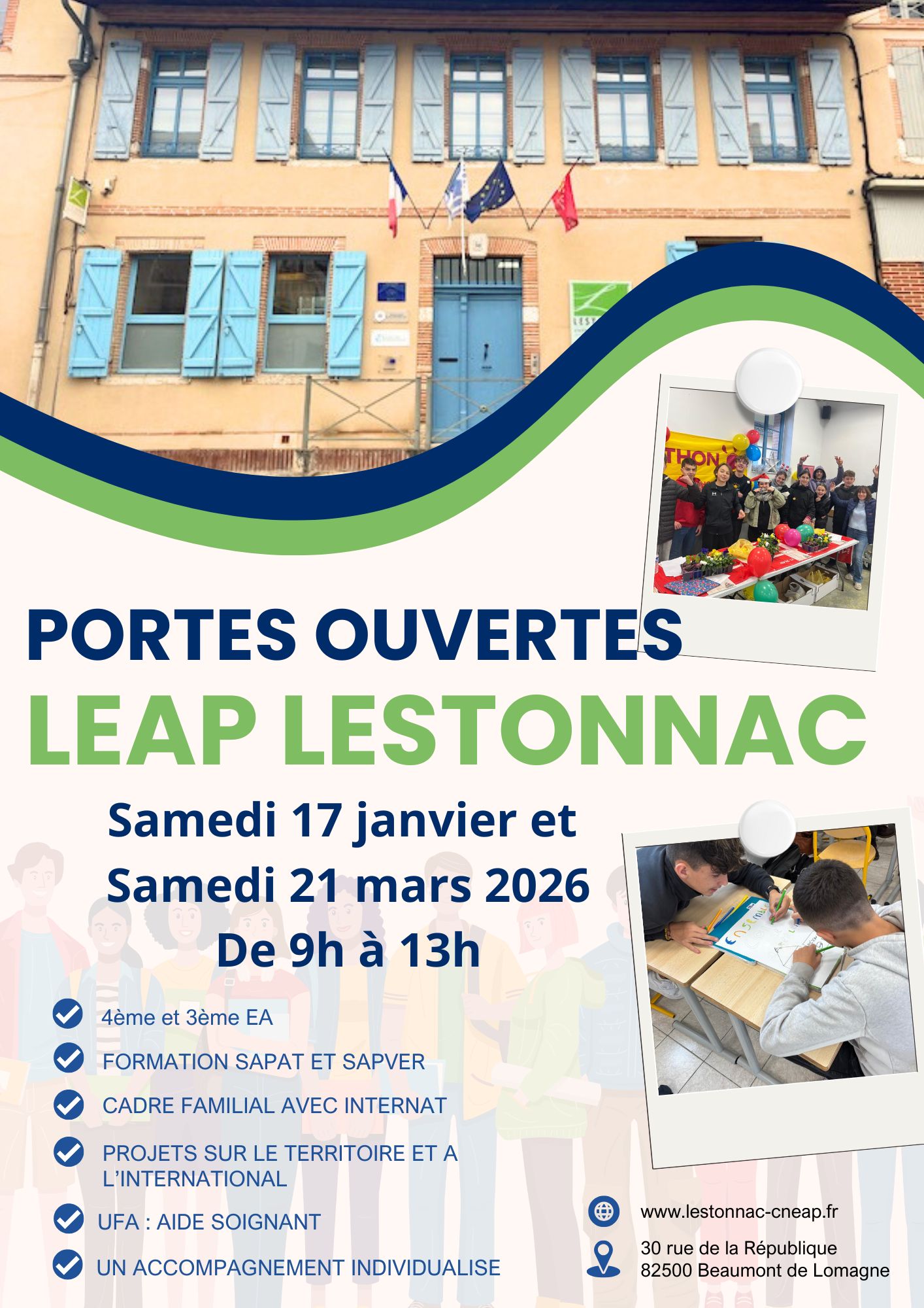 - LEAP LESTONNAC de Beaumont de Lomagne : samedis 17 janvier et 21 mars 2026 de 9h à 13h